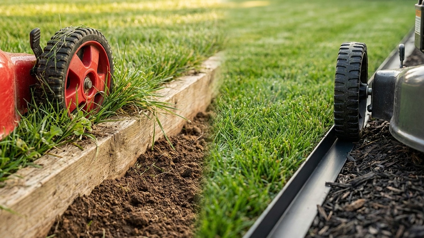 Ma découverte s’appelle la bordure métallique affleurante. Contrairement aux modèles classiques, elle s’installe au niveau exact du sol — ni plus haut, ni plus bas. L’herbe peut ainsi pousser par-dessus sans créer d’obstacle physique.