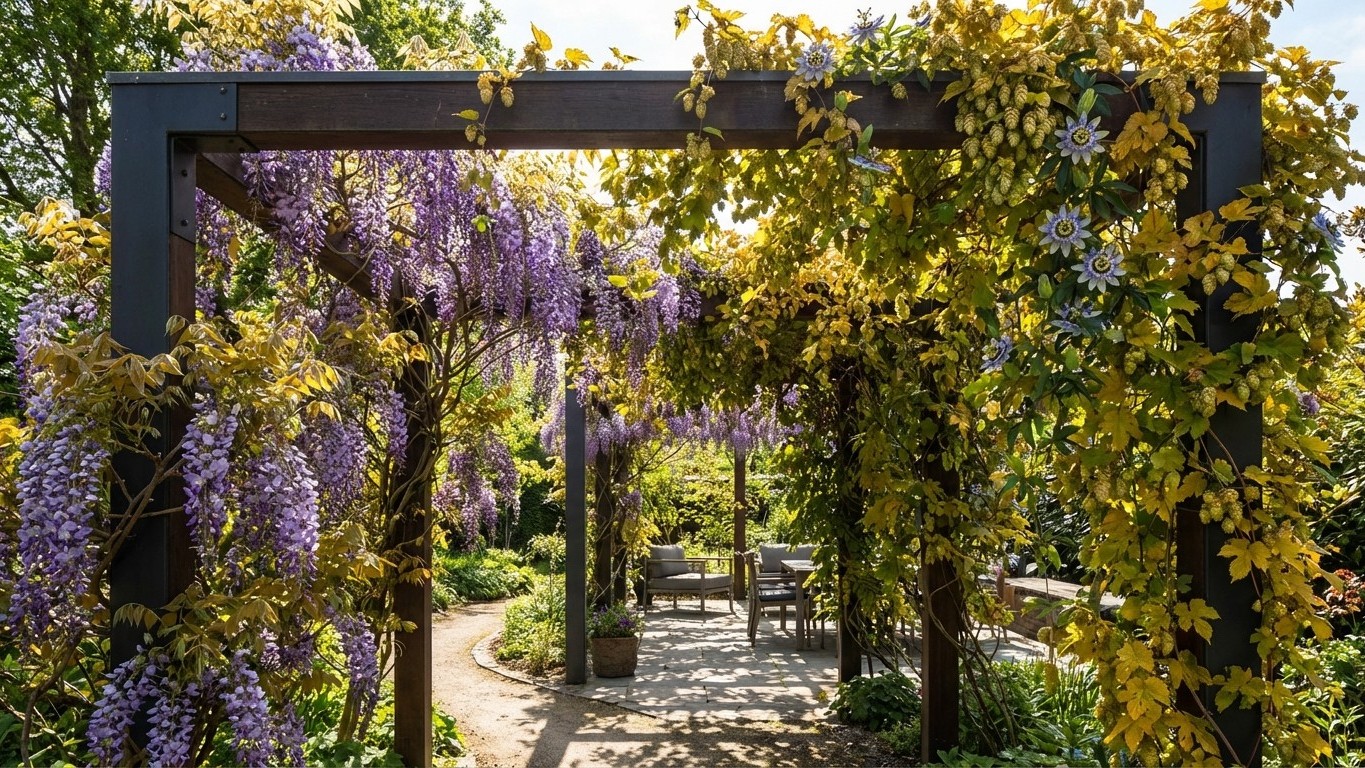 Cette métamorphose express, je la dois au choix stratégique de trois plantes grimpantes aux tempéraments complémentaires, sélectionnées non pas pour leur beauté seule, mais pour leur capacité exceptionnelle à coloniser rapidement l’espace vertical tout en s’adaptant parfaitement aux contraintes d’une pergola exposée.